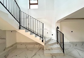 It consists of two bedrooms, 2 bathrooms, a hallway and an open entrance area from which you can descend to the open lower floor where the living room with kitchen and dining room are located. The building was completely renovated in 2025.