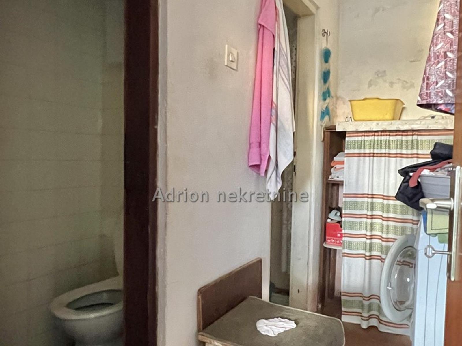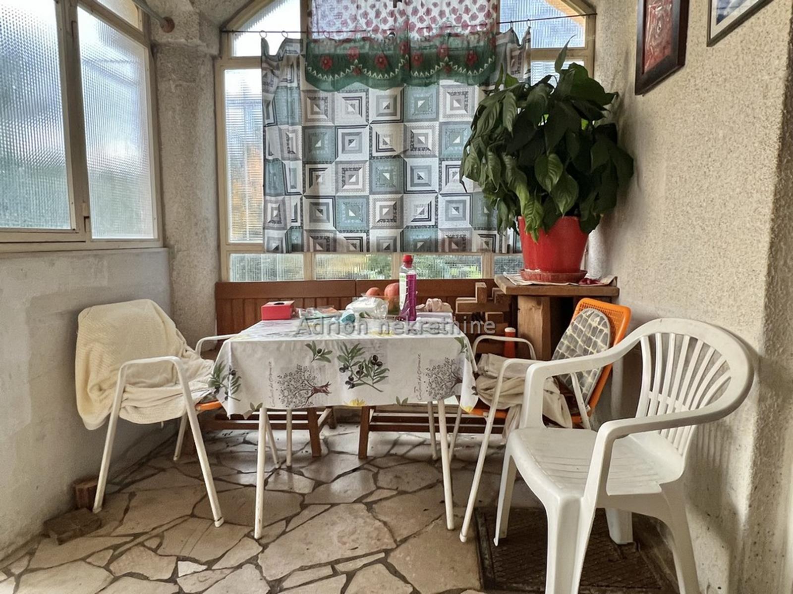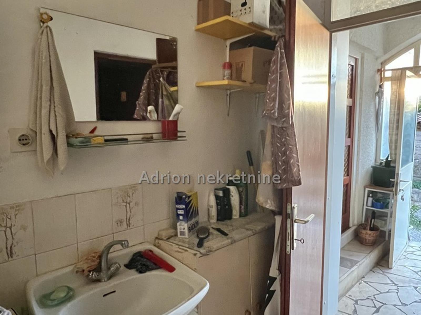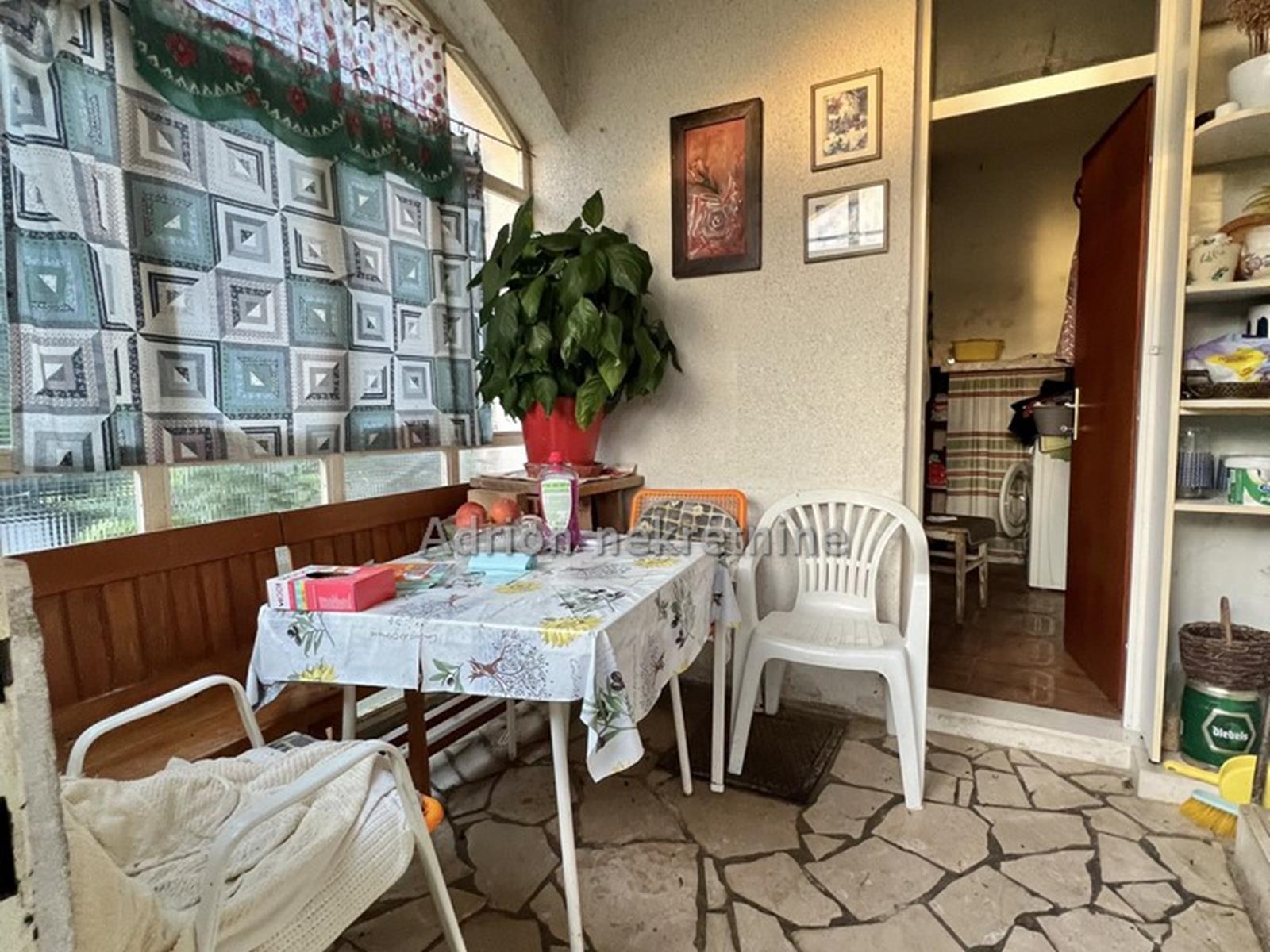 On the ground floor of the house there is an entrance space, a bathroom, a living room with a kitchen and a dining room, from which there are stairs to the first floor, where there are two bedrooms, one of which has a balcony with a view of the sea, and on the first floor there is also a hallway and a bathroom.