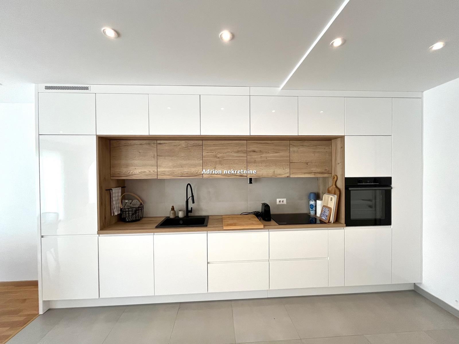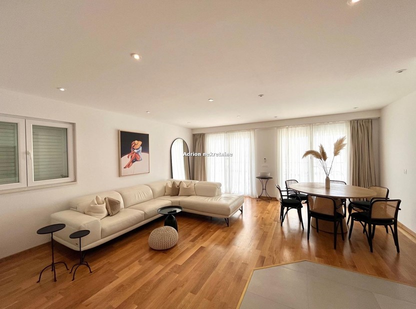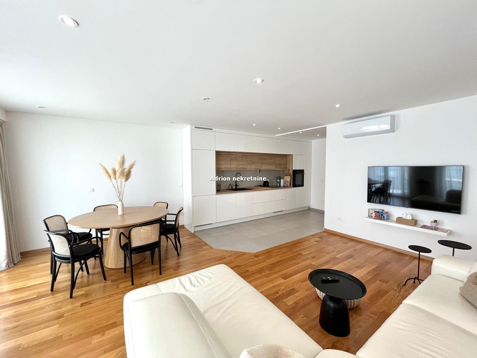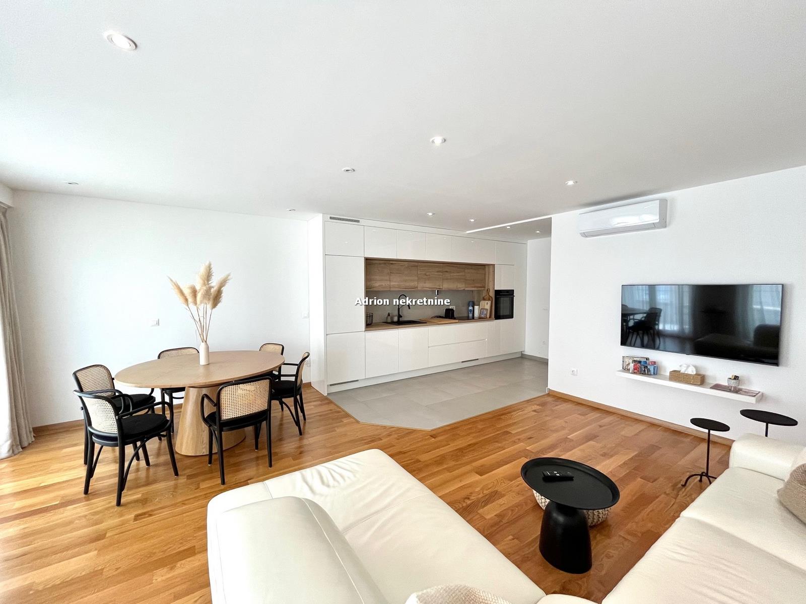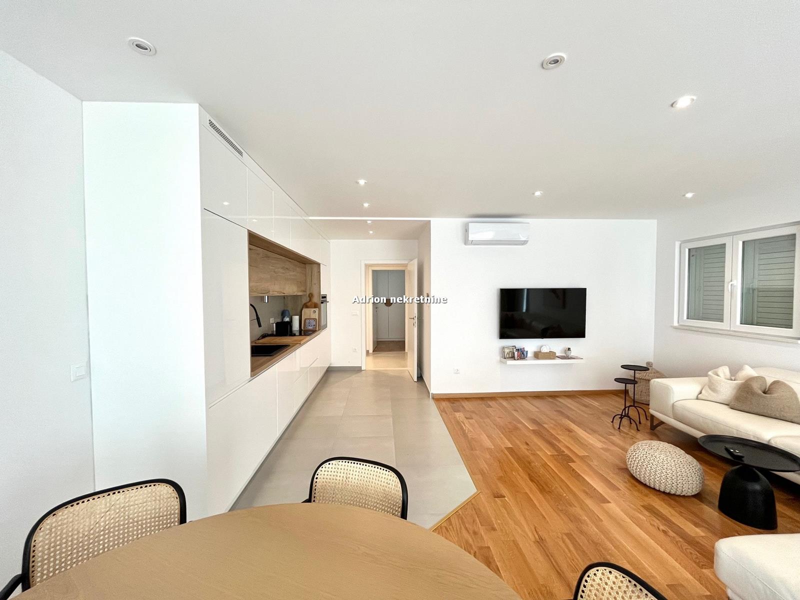Luxurious new two-bedroom apartment is located on the high ground floor of a newer residential building. The property consists of a kitchen, dining room, living room, two bedrooms, two bathrooms and a hallway with a total area of 76.38 m2, net area of 76.38 m2 and secondary parts of two balconies and an outdoor parking space with a total area of 33.22 m2, net area of 12.79 m2, total net area of 89.17 m2.
