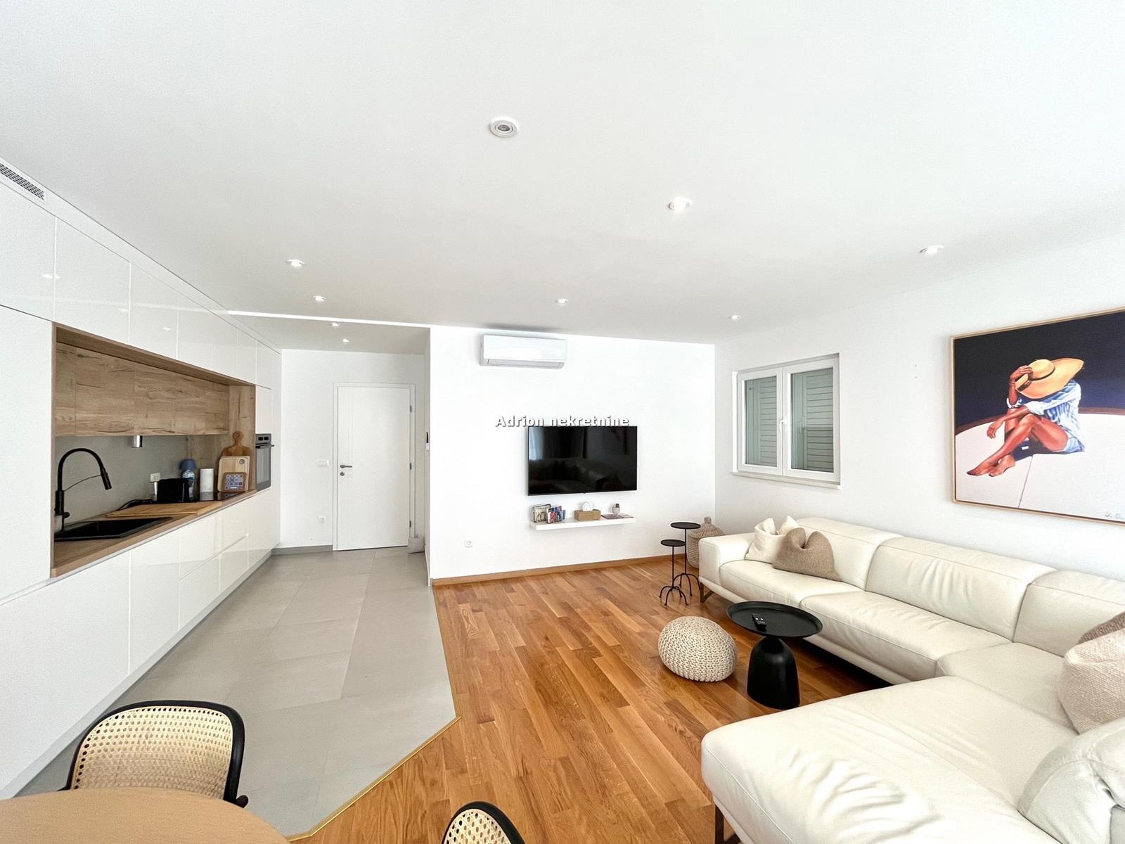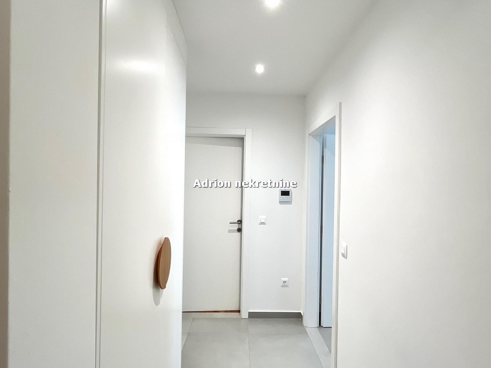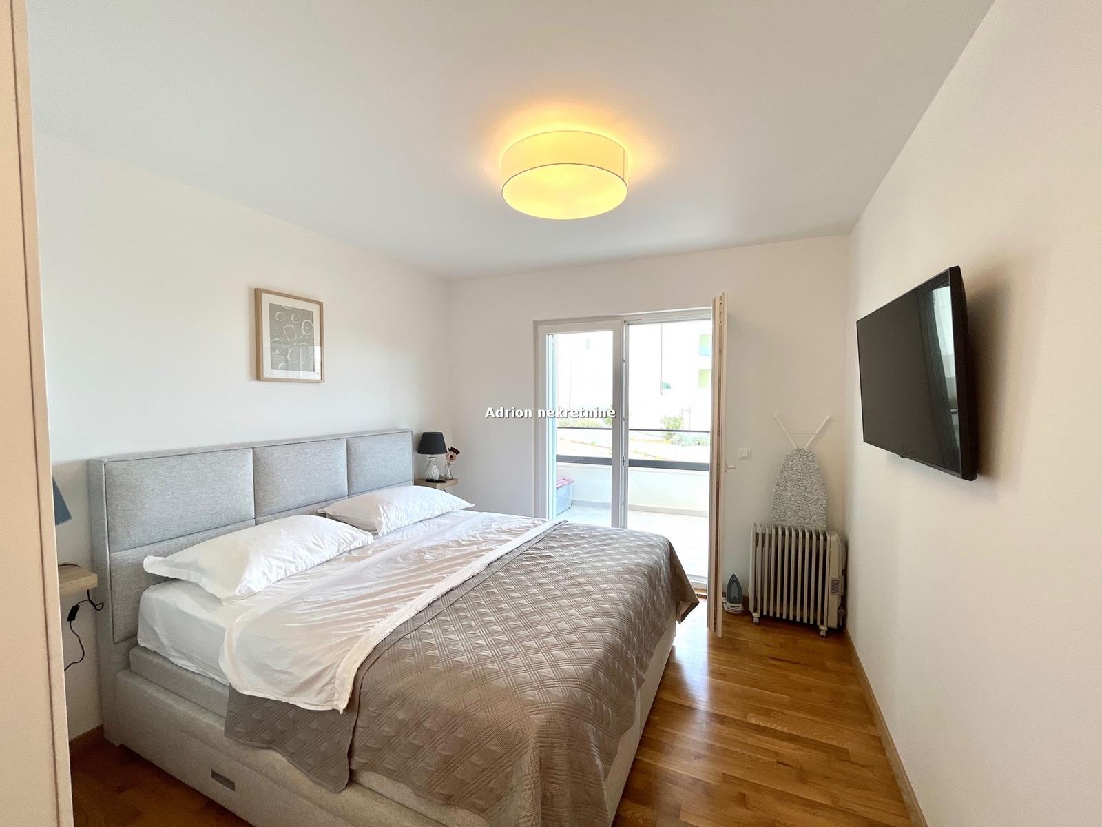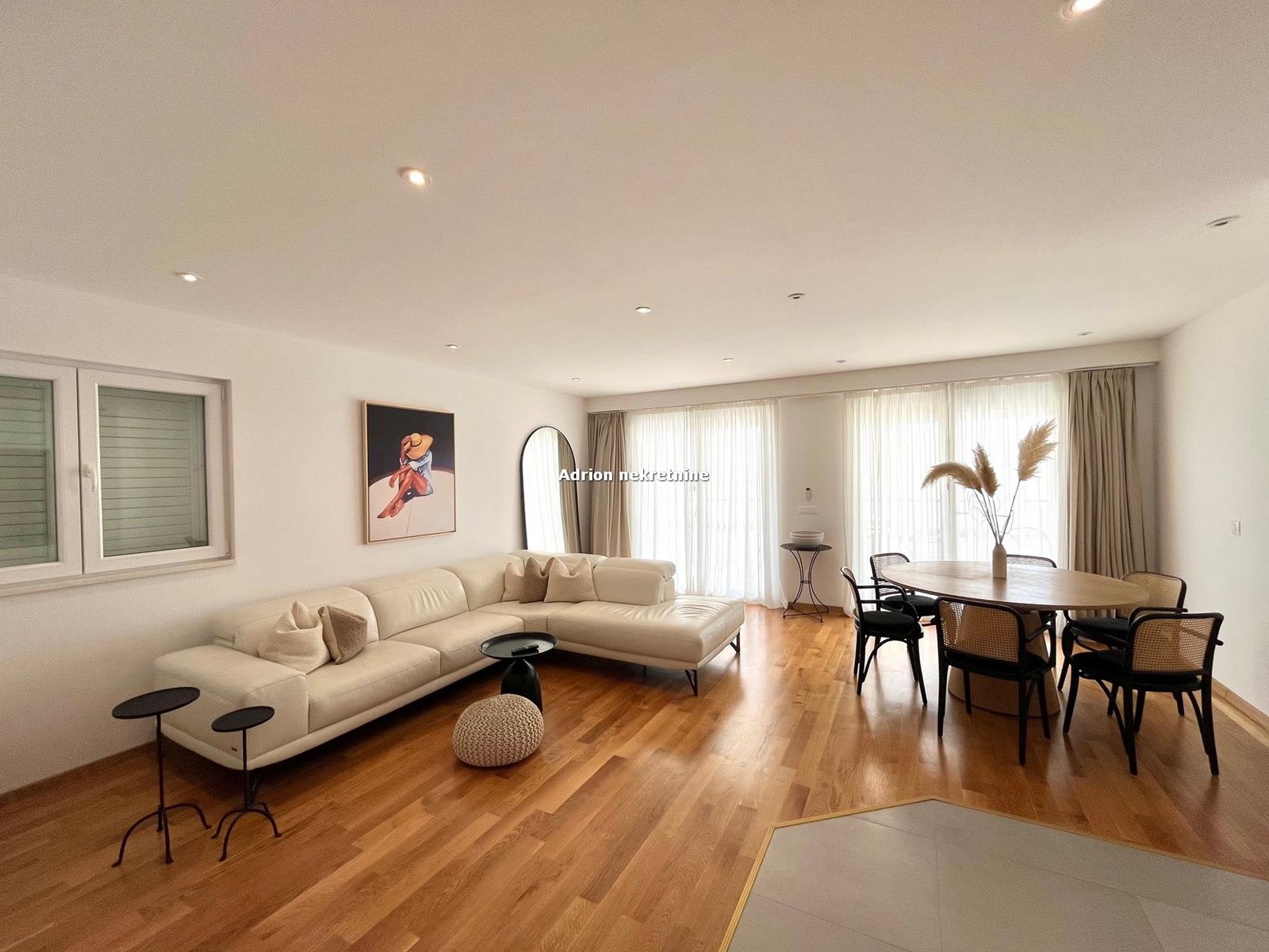 Luxurious new two-bedroom apartment is located on the high ground floor of a newer residential building. The property consists of a kitchen, dining room, living room, two bedrooms, two bathrooms and a hallway with a total area of 76.38 m2, net area of 76.38 m2 and secondary parts of two balconies and an outdoor parking space with a total area of 33.22 m2, net area of 12.79 m2, total net area of 89.17 m2.