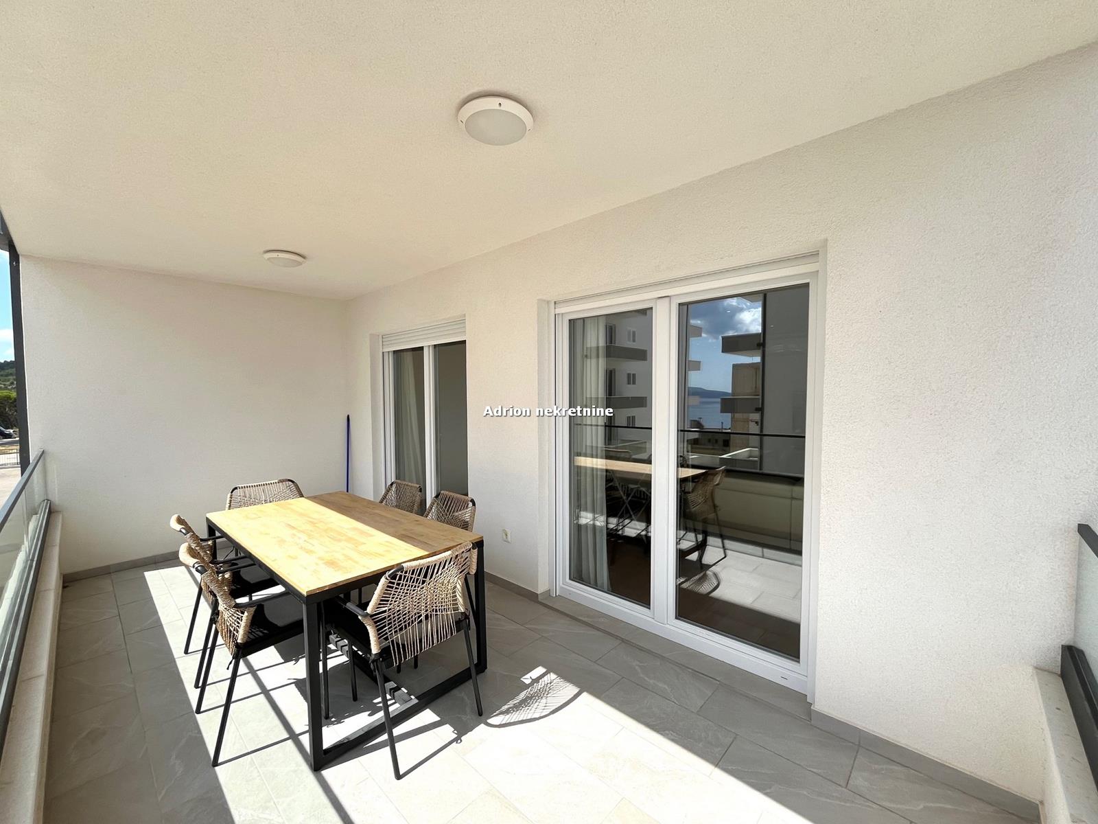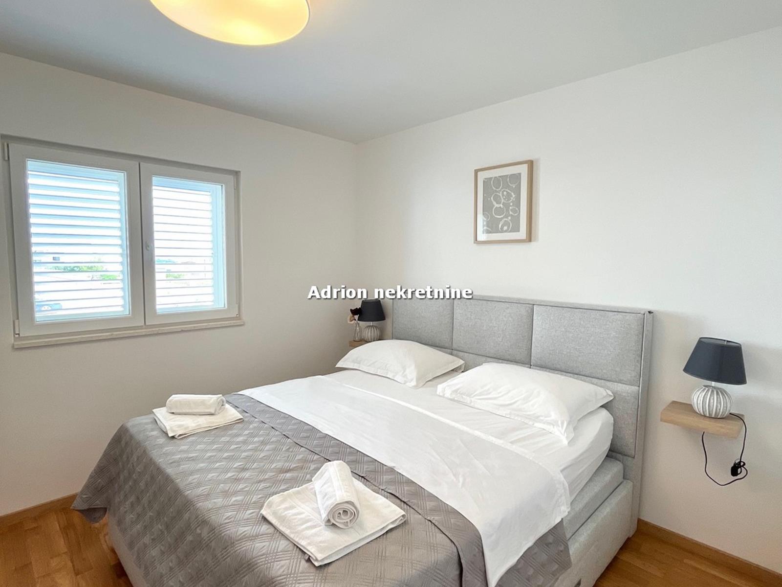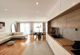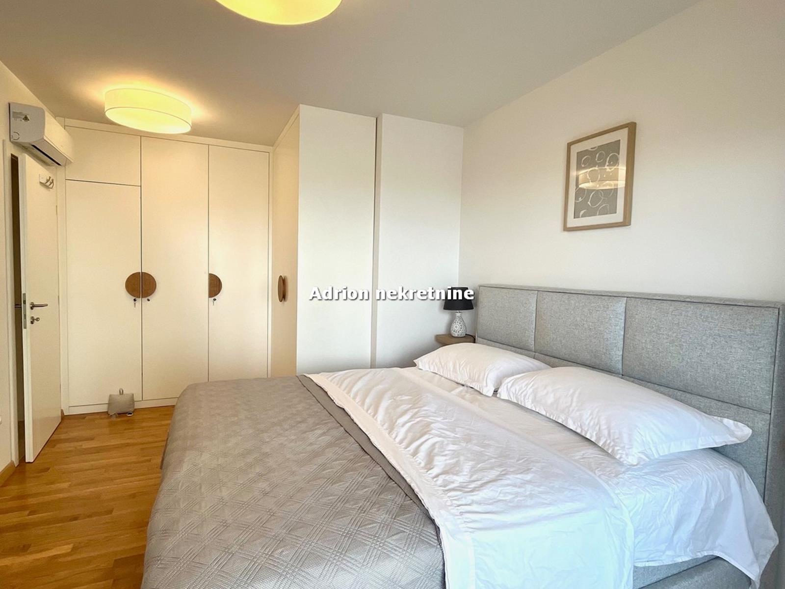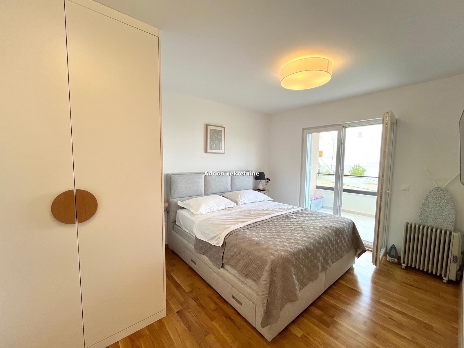 Luxurious new two-bedroom apartment is located on the high ground floor of a newer residential building. The property consists of a kitchen, dining room, living room, two bedrooms, two bathrooms and a hallway with a total area of 76.38 m2, net area of 76.38 m2 and secondary parts of two balconies and an outdoor parking space with a total area of 33.22 m2, net area of 12.79 m2, total net area of 89.17 m2.