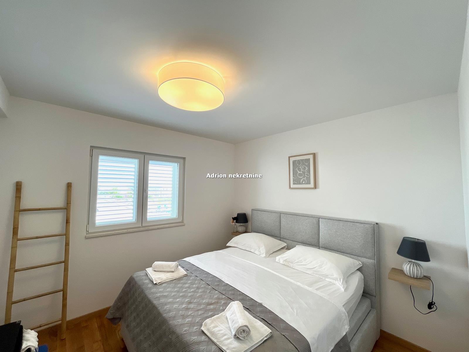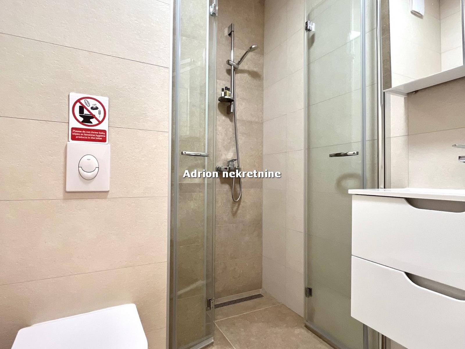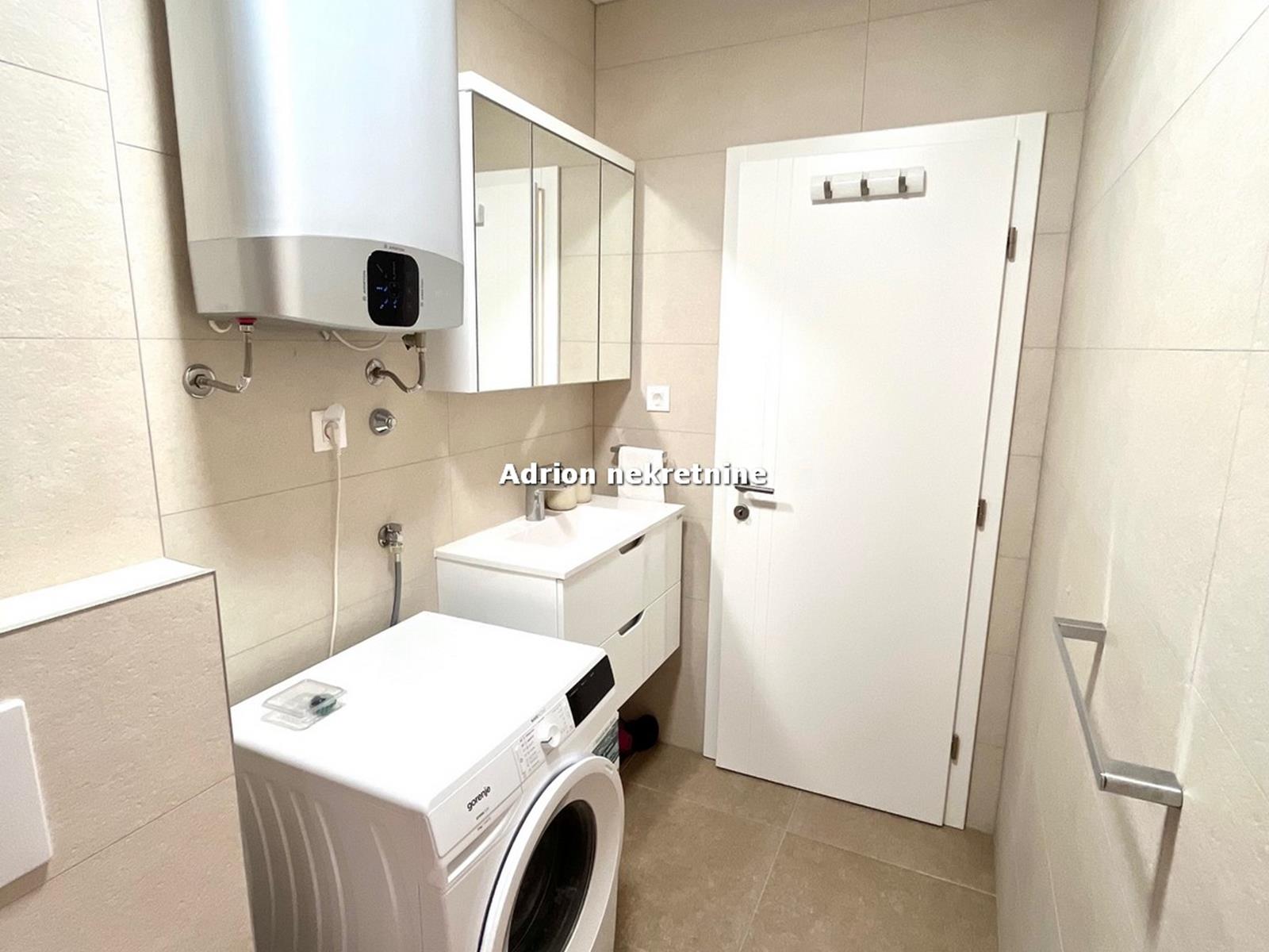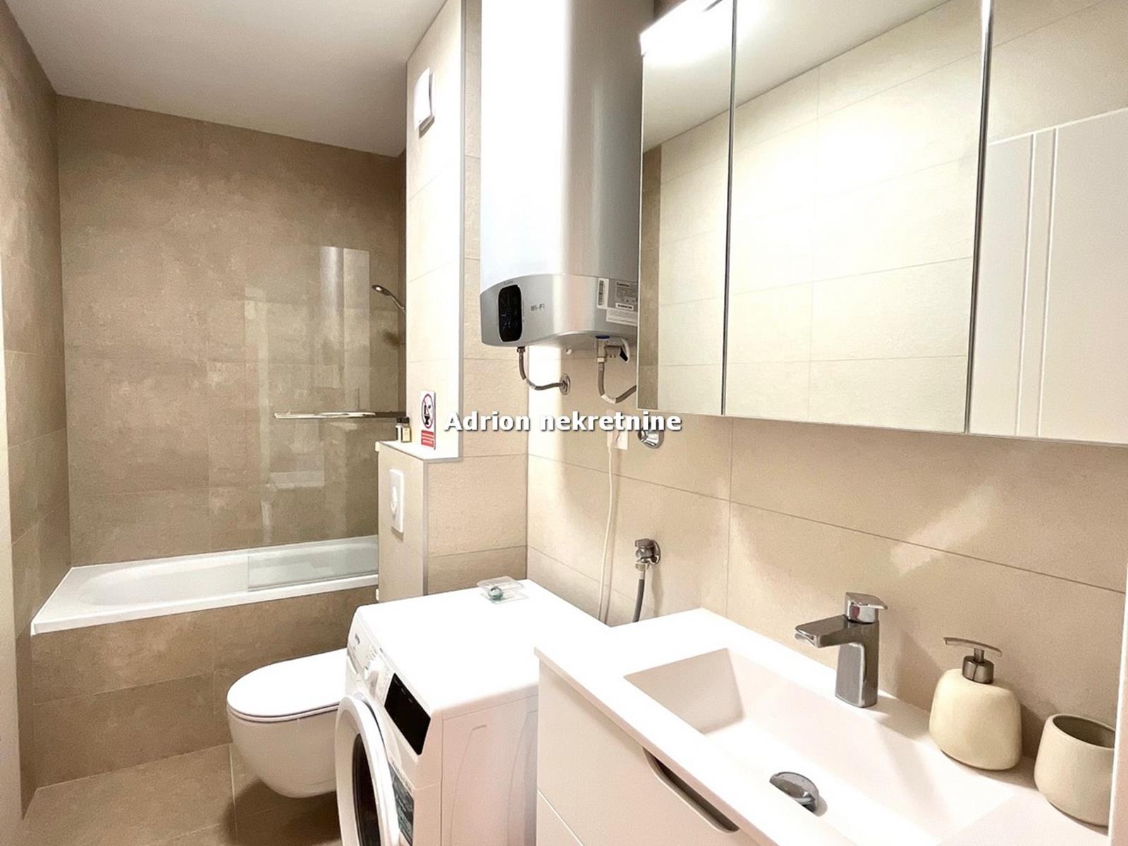 Luxurious new two-bedroom apartment is located on the high ground floor of a newer residential building. The property consists of a kitchen, dining room, living room, two bedrooms, two bathrooms and a hallway with a total area of 76.38 m2, net area of 76.38 m2 and secondary parts of two balconies and an outdoor parking space with a total area of 33.22 m2, net area of 12.79 m2, total net area of 89.17 m2.
