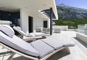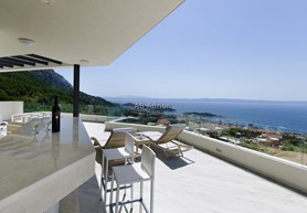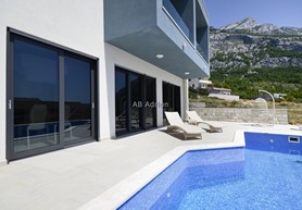 In one of the most exclusive hillside locations in Makarska, this luxury villa has been specially designed to meet the needs of the discerning buyer who is looking for ultra-modern, stylish living. This exceptionally well designed villa has an extensive garden with swimming pool that perfectly complements the contemporary lines of the house. Set in lush green surroundings, with stunning scenery and breath taking sea and city views, the villa enjoys a peaceful environment and has easy access to the city and all its amenities. This villa has been finished to the very exacting, high quality requirements, and has been strategically built to maximize the views. This modern villa combines the very best of modern architecture with the ultimate interiors, installations and technology. There is 400 m2 constructed area, distributed among 3 levels. Villa has 3 bedrooms and 6 bathrooms, open roof terrace with summer kitchen, outside swimming pool, barbeque, nice terraces and irrigated gardens. Living room with dining and kitchen area and a guest toilet are on the main level. On the first floor there are 3 bedrooms with private terraces and en-suite bathrooms and walk-in closets. The basement consists of a gym with a bathroom and a custom build sauna for 4 people, garage, swimming pool technical room, laundry room with a technical room where is placed the smart-house system (which system controls everything what is in the house and around the house connected on electrician power (TV, surround-sound, lights, entrance gate, cameras etc.) The villa offers privacy, comfort, panoramic views of sea, city and mountain all combine with a high level of equipment and designer furniture’s.