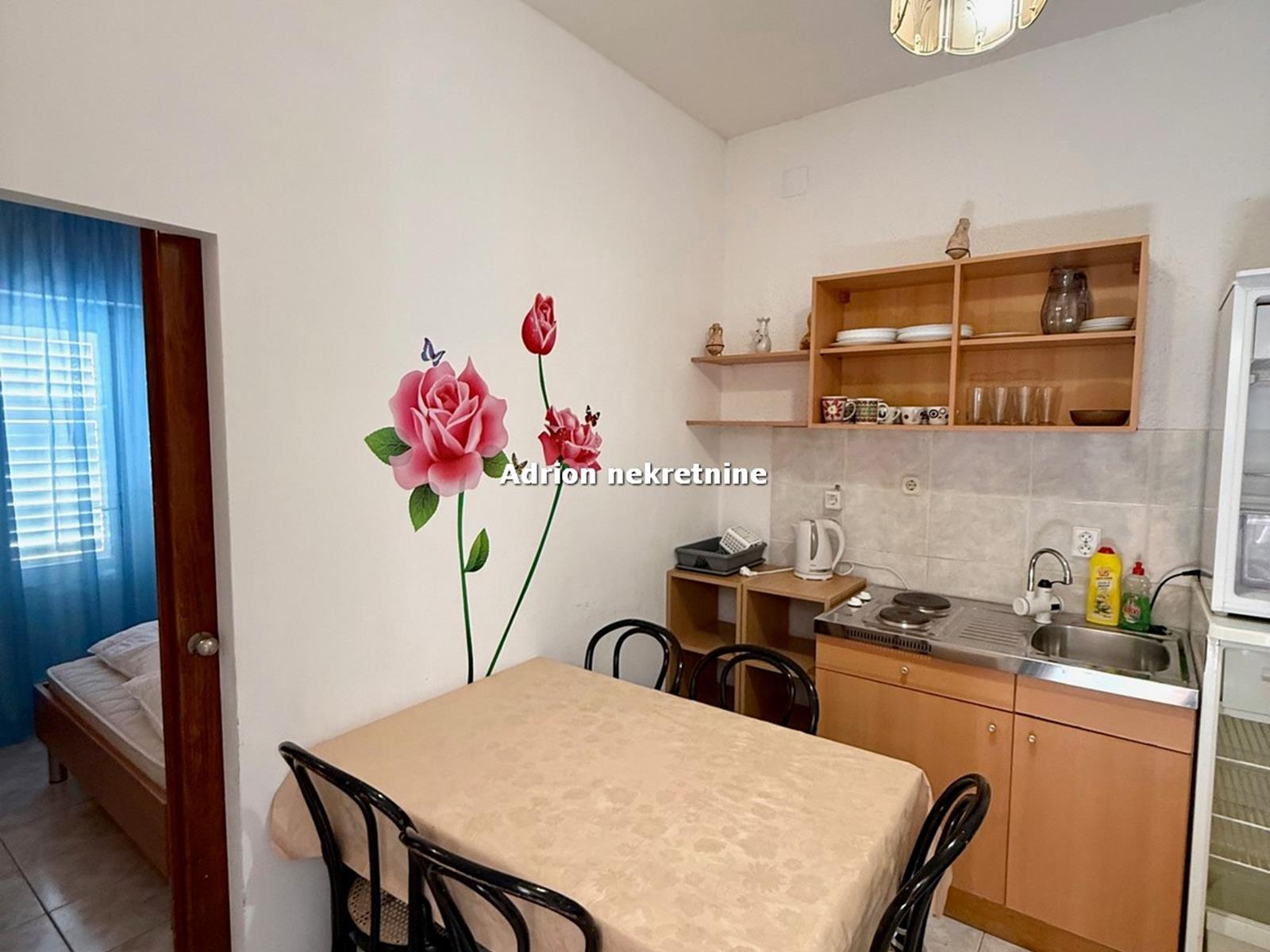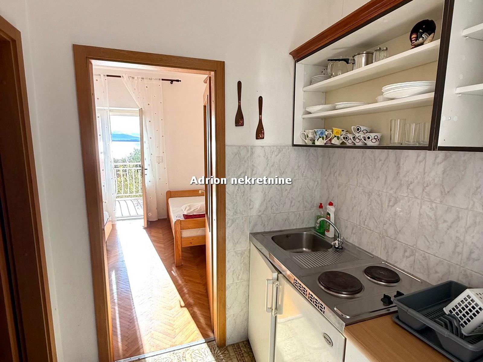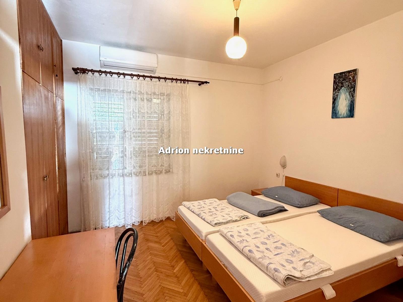U prizemlju su 4 apartmana (2 četverokrevetna i 2 dvokrevetna). U naravi se radi o 4 južno orijentirane spavaće sobe s izlazom na balkon s kojeg se pruža prekrasan pogled na more. Dvije spavaće sobe smještene su sa sjeverne strane etaže. Tri kuhinje, 4 wc-a, hodnika, predsoblja i loggie.