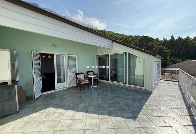 Prodaje se apartmanska kuća u Brelima 160 metara mora. Lokacija Soline. Kuća se sastoji od suterena, prizemlja i 3 etaže. U suterenu se nalazi garaža u koju se mogu parkirati dva automobila. Na krovu garaže su vanjska parking mjesta za 3 automobila. U prizemlju je smještena jedna stambena jedinica koja je u naravi jednosoban stan koji se sastoji od prostrane terase s prekrasnim pogledom na more, kuhinje, kupaonice, dnevne sobe i ostave. Na prvom katu kuće koji ima zaseban ulaz smješten je stan koji je podijeljen u dva dijela ovisno o potrebi. Prvi dio stana sastoji se od dnevne sobe, kuhinje, kupaonice i terase s pogledom na more. Drugi dio stana sastoji se od 4 sobe, 4 kupaonice i 3 balkona. Jedna soba ima kuhinju. Svaka soba opremljena je klimom i tv-om. Stan ima zajednički hodnik. Na zadnjoj etaži nalazi se prostrani stan koji se sastoji od dvije spavaće sobe, dvije kupaonice, kuhinje, dnevne sobe i prekrasne prostrane južne terase sa spektakularnim pogledom. Tavan ima visinu od cca. jednog metra. Kuća ima betonski krov, a istočna i sjeverna strana kuće imaju termo fasadu. Napravljena je nova fasada prije 10 godina i stavljeni su novi otvori.