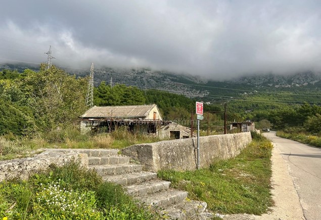 Građevinsko zemljište u Baškoj Vodi, iznad magistrale, površine 684 m2. Parcela je pravilnog pravokutnog oblika smještena uz pristupni put i potok, okvirnih dimenzija 16 m x 41 m. U naravi je to uređeno i ograđeno zemljište smješteno uz pristupnu cestu na kojem je '80-tih godina izgrađena kućica površine cca 50 m2, koja nije legalizirana. Kućica se sastoji u prizemlju od dnevnog boravka sa kuhinjom i blagovaonicom, radione u drugom dijelu prizemlja te šufita (tavana) koji služi kao spremište.