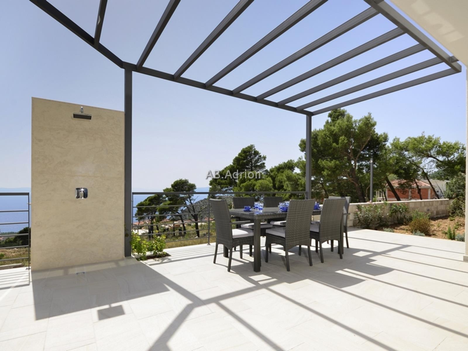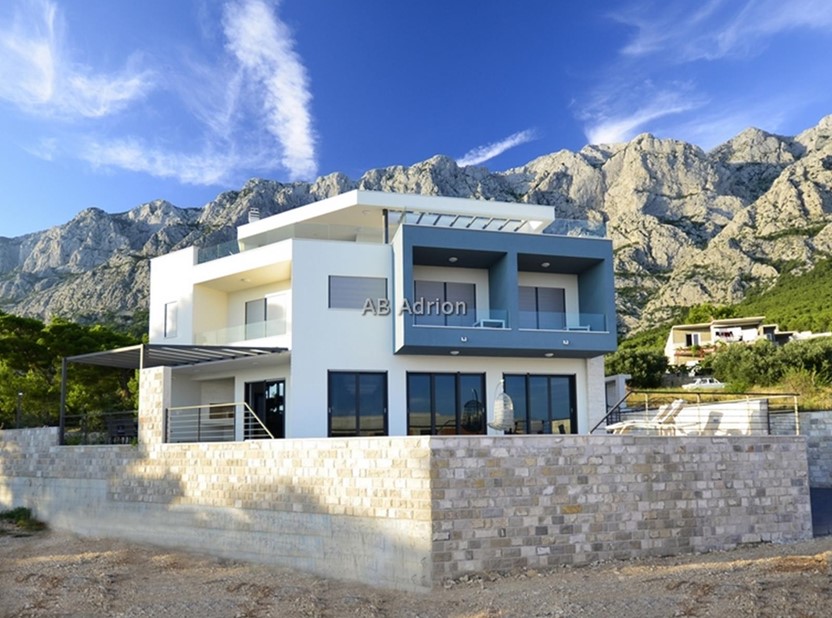 In one of the most exclusive hillside locations in Makarska, this luxury villa has been specially designed to meet the needs of the discerning buyer who is looking for ultra-modern, stylish living. This exceptionally well designed villa has an extensive garden with swimming pool that perfectly complements the contemporary lines of the house. Set in lush green surroundings, with stunning scenery and breath taking sea and city views, the villa enjoys a peaceful environment and has easy access to the city and all its amenities. This villa has been finished to the very exacting, high quality requirements, and has been strategically built to maximize the views. This modern villa combines the very best of modern architecture with the ultimate interiors, installations and technology. There is 400 m2 constructed area, distributed among 3 levels. Villa has 3 bedrooms and 6 bathrooms, open roof terrace with summer kitchen, outside swimming pool, barbeque, nice terraces and irrigated gardens. Living room with dining and kitchen area and a guest toilet are on the main level. On the first floor there are 3 bedrooms with private terraces and en-suite bathrooms and walk-in closets. The basement consists of a gym with a bathroom and a custom build sauna for 4 people, garage, swimming pool technical room, laundry room with a technical room where is placed the smart-house system (which system controls everything what is in the house and around the house connected on electrician power (TV, surround-sound, lights, entrance gate, cameras etc.) The villa offers privacy, comfort, panoramic views of sea, city and mountain all combine with a high level of equipment and designer furniture’s.