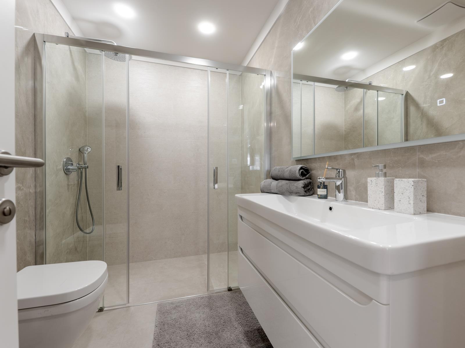 The highest quality construction! (Insulation with stone wool 8 cm thick, additional insulation inside the apartments, large-sized lifting sliding walls with thermal insulating glass, "Blindo" fireproof entrance doors, and 1st class internal veneered doors, white color, LED lighting, all rooms air-conditioned, in the staircases Brač stone and stainless steel railing, in the bathrooms underfloor heating, high-quality ceramics - Kerlite panels measuring 2.40 m x 1.25 m, high-quality bathroom cabinets with sinks and hanging toilets with "soft-close" boards. Larger shower areas on the "walk-in" principle with glass shower cabins.)