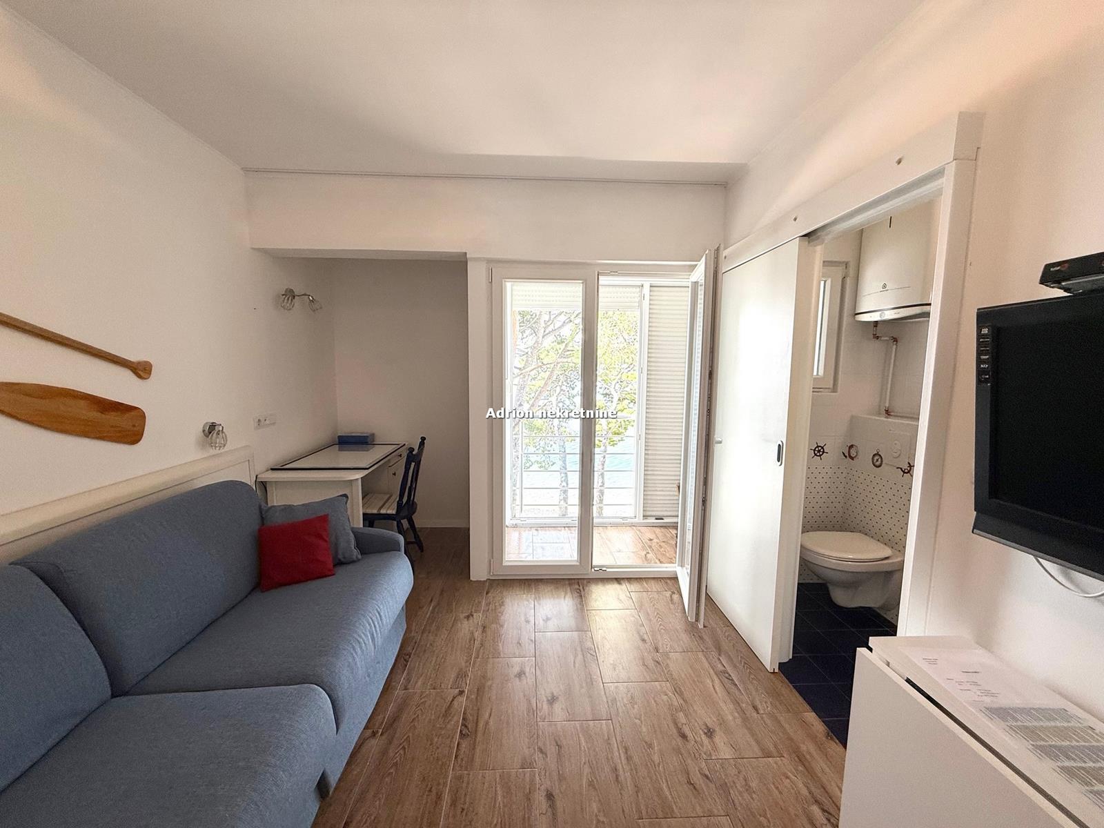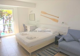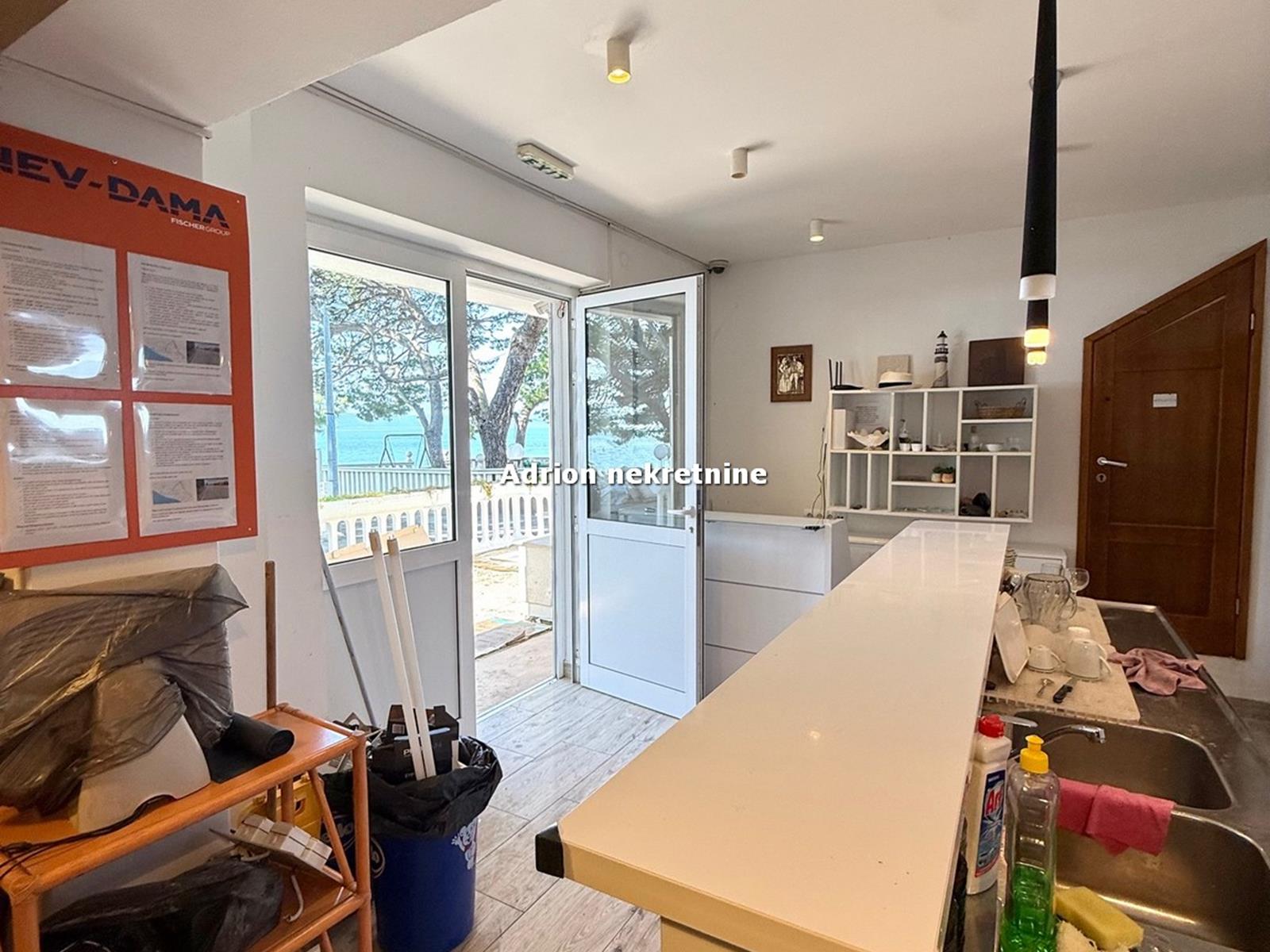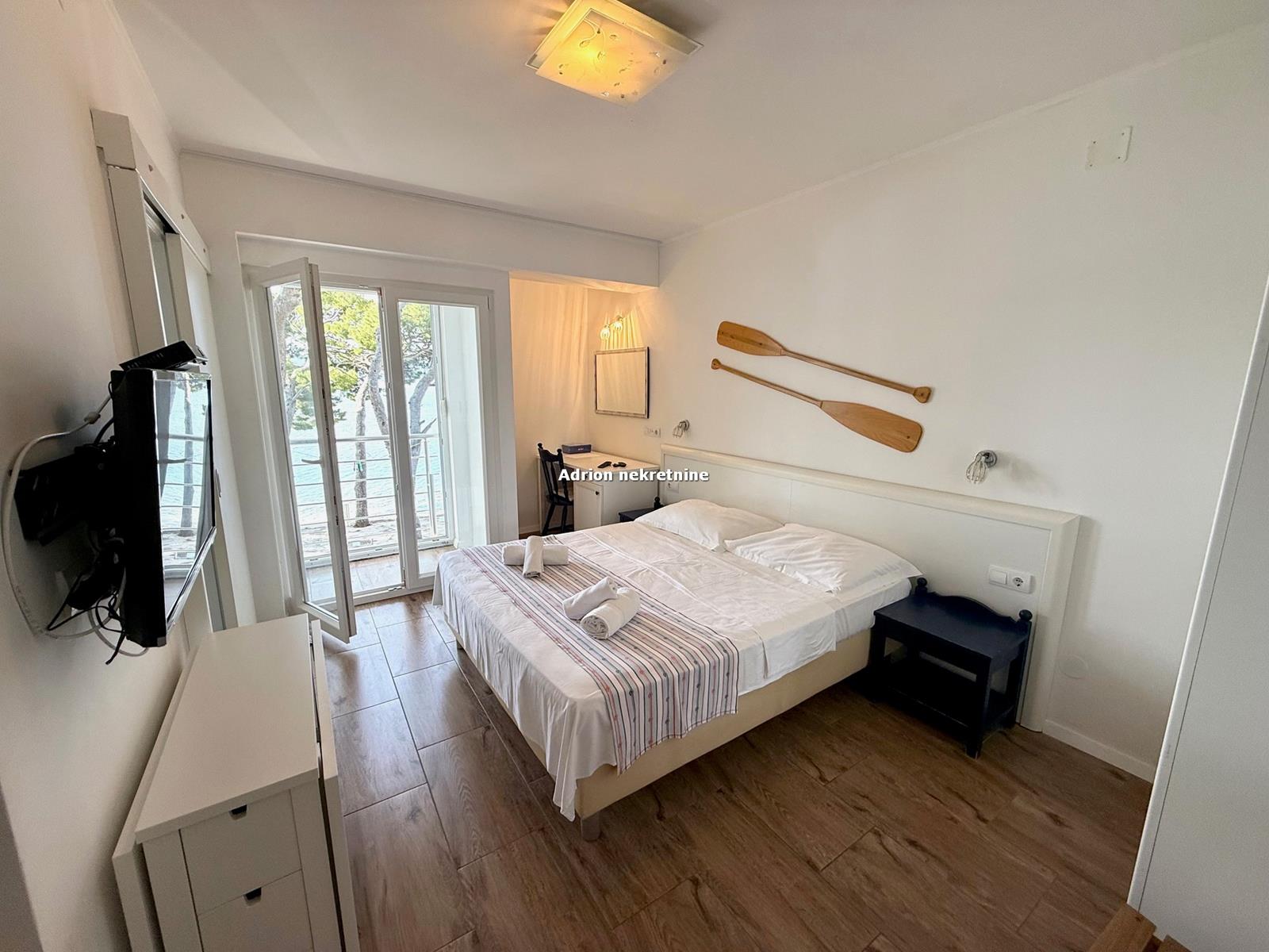 Hotel na Makarskoj rivijeri u prvom redu do mora. U naravi se radi o obiteljskom hotelu koji je smješten na samoj plaži u malom turističkom mjestu nedaleko od Makarske. Površina hotela iznosi 533 m2 na četiri nadzemne etaže, a ukupan kapacitet je 34 osobe. U prizemlju se nalazi potpuno opremljen restoran (34 sjedeća mjesta unutra) sa prostranom vanjskom terasom površine 100 m2 (60 sjedećih mjesta odmah do plaže), bar, kuhinja, recepcija, wc-i za goste, kupatilo za osoblje i spremište. Na prvom i drugom katu se nalazi 10 soba (dva i tri ležaja) sa kupatilima. Sobe su opremljene TV-om, internetom, klimom i malim balkonom. U sobama su pripremljene instalacije za ugradnju mini-blok kuhinje tako da se iste lako mogu transformirati u studio apartmane. Na trećem katu se nalaze dva apartmana. Apartman 1 od 40 m2, sastoji se od jedne spavaće sobe, kupatila, kuhinje s blagovaonom i dnevnim boravkom s kaminom, ukupno za smještaj 4 osobe. Kupatilo je opremljeno finskom saunom i masažnom kadom.Apartman 2 od 20 m2, sastoji se od jedne spavaće sobe, kupatila, kuhinje s blagovaonom i dnevnim boravkom, ukupno smještaj za 3 osobe. Kupatilo je opremljeno masažnom tuš kabinom sa turskom saunom. Iz apartmana 2 je izlaz na veliku krovnu terasu sa roštiljem. Hotel je potpuno renoviran 2014. godine u mediteranskom stilu, kompletno je opremljen i namješten, klimatiziran sa provedenim centralnim grijanjem kroz cijeli objekat te se takav i prodaje. Cijeli objekat je južno orijentiran te se iz svakog kutka kuće pruža pogled na more, otoke i prekrasnu šljunčanu plažu ispred hotela. Parking je osiguran za sve goste hotela. Sama lokacija ovog hotela je idealna je za investiranje u turističku djelatnost.