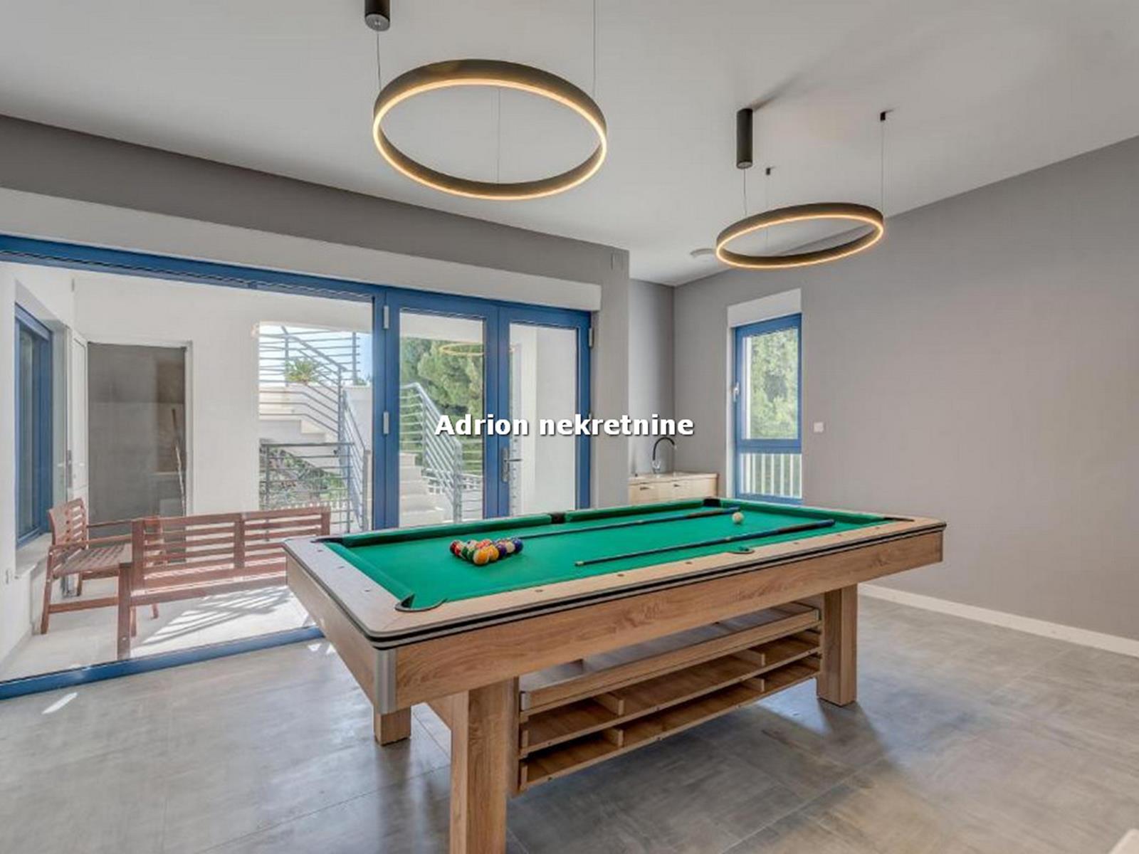 Luksuzno opremljena kuća za odmor sa vanjskim i unutarnjim bazenom smještena je na vrlo atraktivnoj lokaciji, samo 130 metara od plaže. Suvremena arhitektura ove luksuzno opremljene kuće za odmor pruža predivni pogled na more, otoke i planinu. Kuća se sastoji od podruma, suterena, prizemlja i 1. kata sa ukupnom bruto površinom kuće od 499,60 m2, dok joj je neto razvijena površina je 443,75 m2. Izgrađena je na zemljištu površine 567 m2, sa tlocrtnom površinom kuće od 174 m2.
