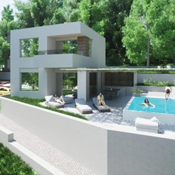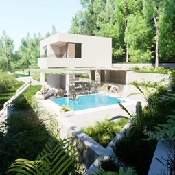 Građevinsko zemljište za gradnju dva manja objekta sa bazenima te postojećim kamenim ruševnim kućama u podnožju građevinskog zemljišta.