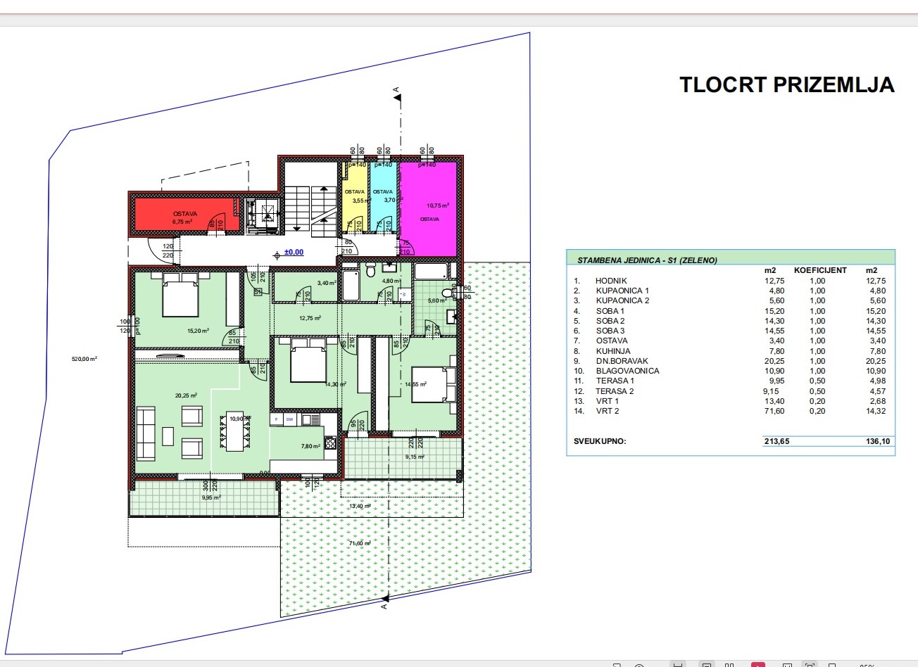Površina stana je 136,10 m2 . Stan se sastoji od hodnika, dvije kupaonice, tri sobe, kuhinje, dnevnog boravka, blagovaonice i terase 1 = 9.95 m2 . terase 2 = 9.15 m2 te prostranog vrta 85 m2 . Stan se nalazi u prizemlju objekta.