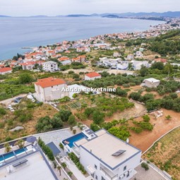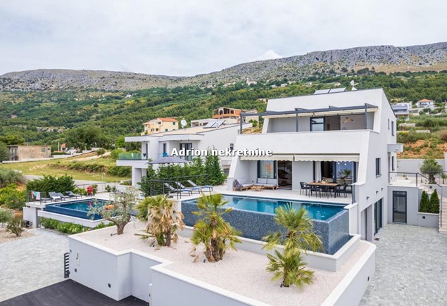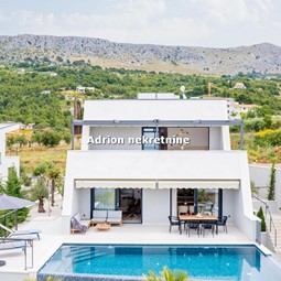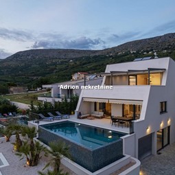 Vila s bazenom modernog dizajna, visokog standarda kvalitete gradnje i stupnja opremljenosti, smještena na na uzvisini s prekrasnim panoramskim pogledom na more.