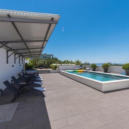 Vila s bazenom izgrađena je 2018. godine na zemljištu površine 621 m2. Prostor vile od 183 proteže se kroz 2 etaže; prizemlje i 1. kata. Na dvorište vile otpada 415 m2, a na bazen 23 m2. U prizemlju vile nalazi se bazen , dječje igralište, prostor za roštiljanje i opuštanje, dnevni boravak, kupaonica , kuhinja te jedna spavaća soba. Prvi kat vile ima dnevni boravak, kuhinju, kupaonicu i jednu spavaću sobu s vlastitim balkonom s otvorenim pogledom na more i okruženje. U izgradnji vile korišteni su najkvalitetniji materijali čime je zagarantirana kvaliteta i postojanost. Eksterijer i interijer ove moderne i elegantne vile je opremljen kvalitetnom opremom, namještajem te tehnologijom koja omogućava ugodan i kvalitetan život. Ovoj vili nije moguće zagraditi pogled u budućnosti.
